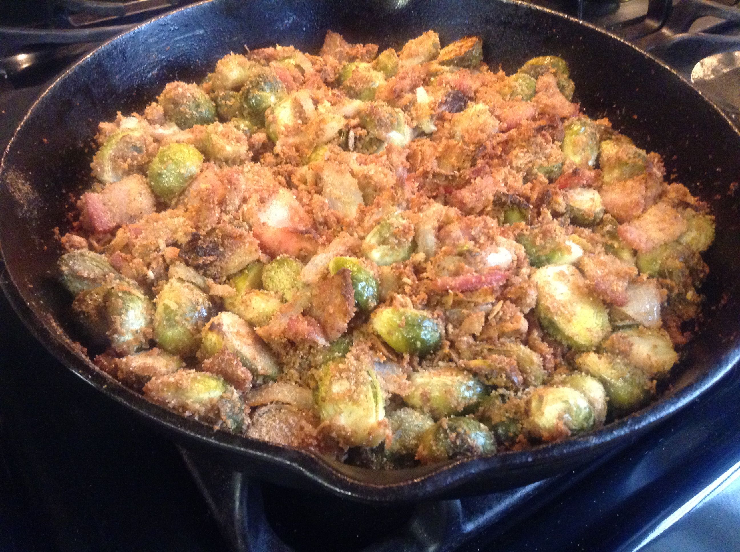 We’re regularly experimenting with the best way to cook brussels sprouts. These adorable green bulbs find their way into our shopping cart at least two to three times per month. We’ve been stuck in a rut of simply blanching then sautéing our sprouts with bacon. With this recipe, I was going for a softer sprout, but still nicely caramelized, with a crunchy crust, brought here by breadcrumbs and parmesan. The two-phase cooking here also prevents the bacon from overcooking.
