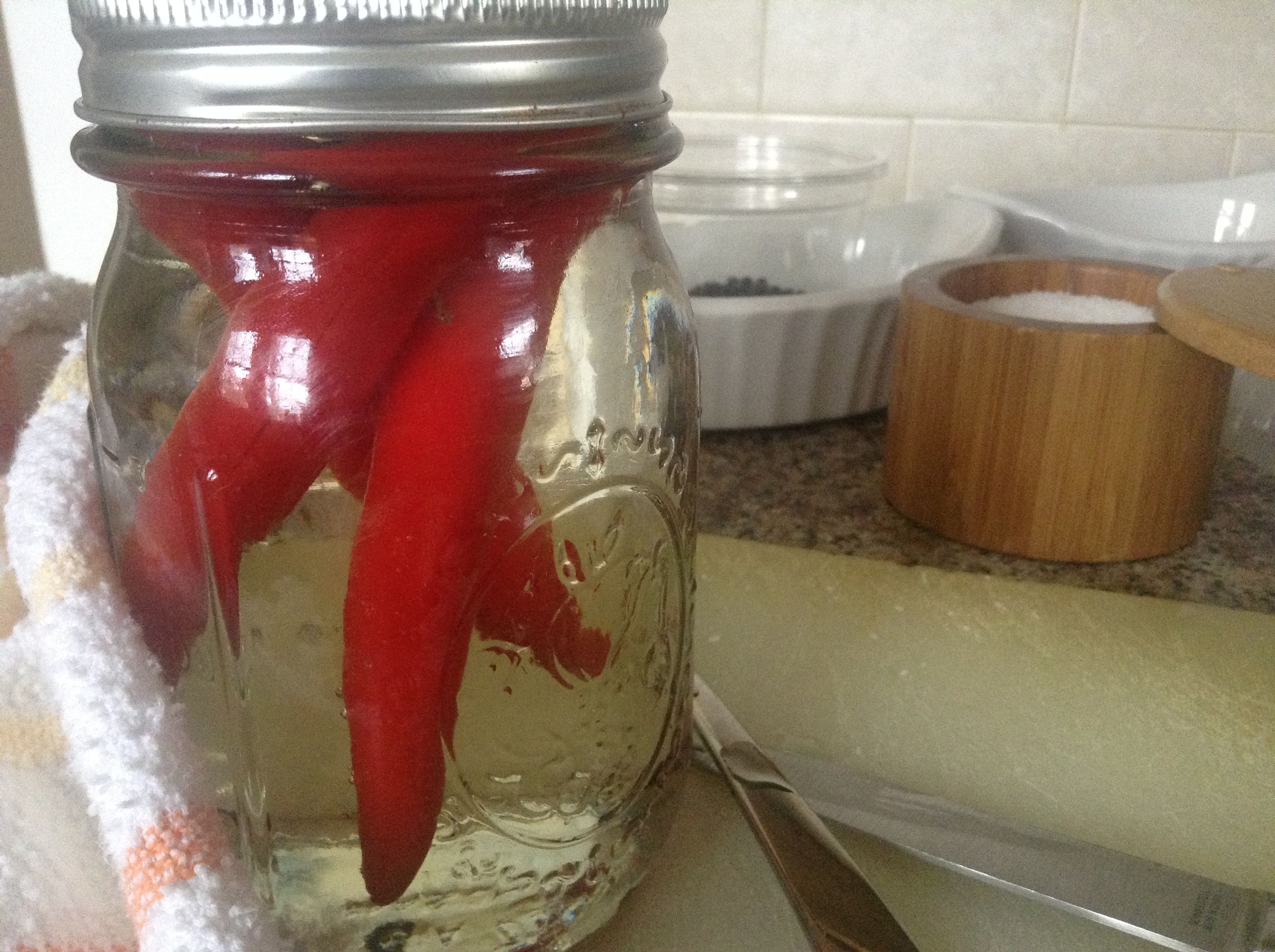 As of this afternoon, my husband and I have visited eight–eight!–different grocery stores looking for–but not finding–pickled chilies for the Thai Hot and Sour Soup that we planned to make this week. The recipe, from The Culinary Institute’s The New Book of Soups, calls for 1/2 a pickled chili and we are not about to go without because the recipe tells us, “All of the ingredients are crucial to the overall flavor, so don’t leave anything out.” Stumped, irritated, and standing in the middle of the Giant, I decided I would make my own damn pickled chilies.