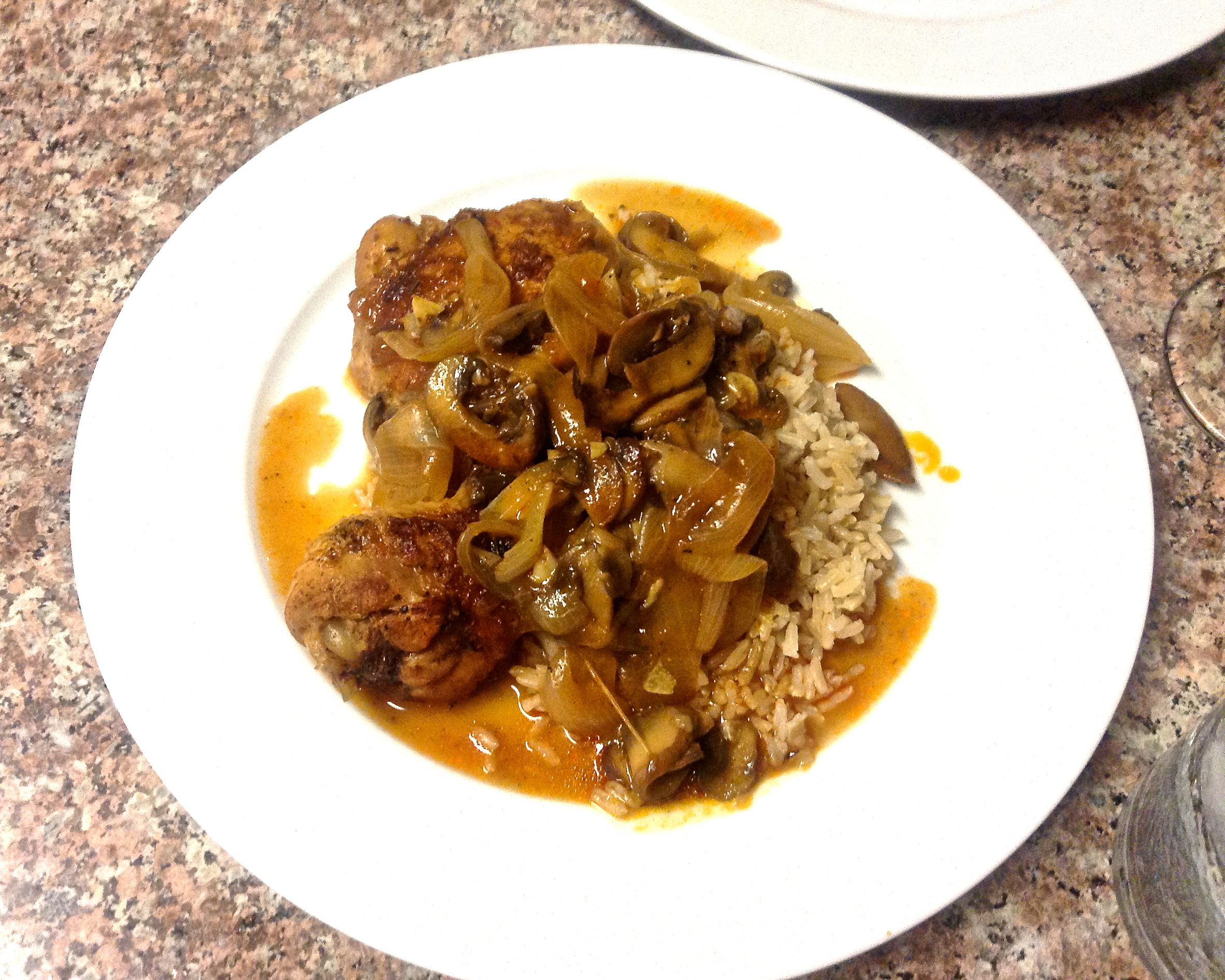 Adapted from: Emeril Lagasse’s Braised Chicken Thighs with Button Mushrooms. Recipe published in New New Orleans Cooking, by Emeril Lagasse and Jessie Tirsch, William Morrow, 1993.