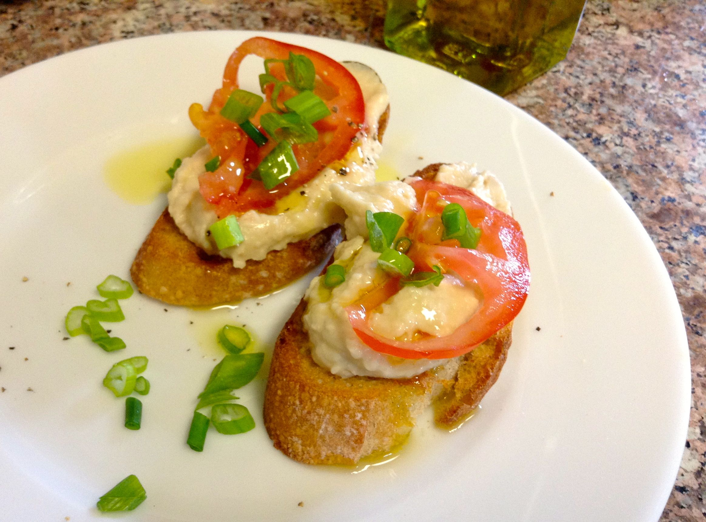 Place the beans, lemon juice, olive oil, and garlic into the bowl of your food processor and process to desired consistency. Scoop the dip into a bowl to serve it family style. Sprinkle the sliced scallions on top and drizzle with olive oil if desired. We topped ours with sliced tomatoes. I also had this for lunch the next day spread on a hunk of French bread. Delish.